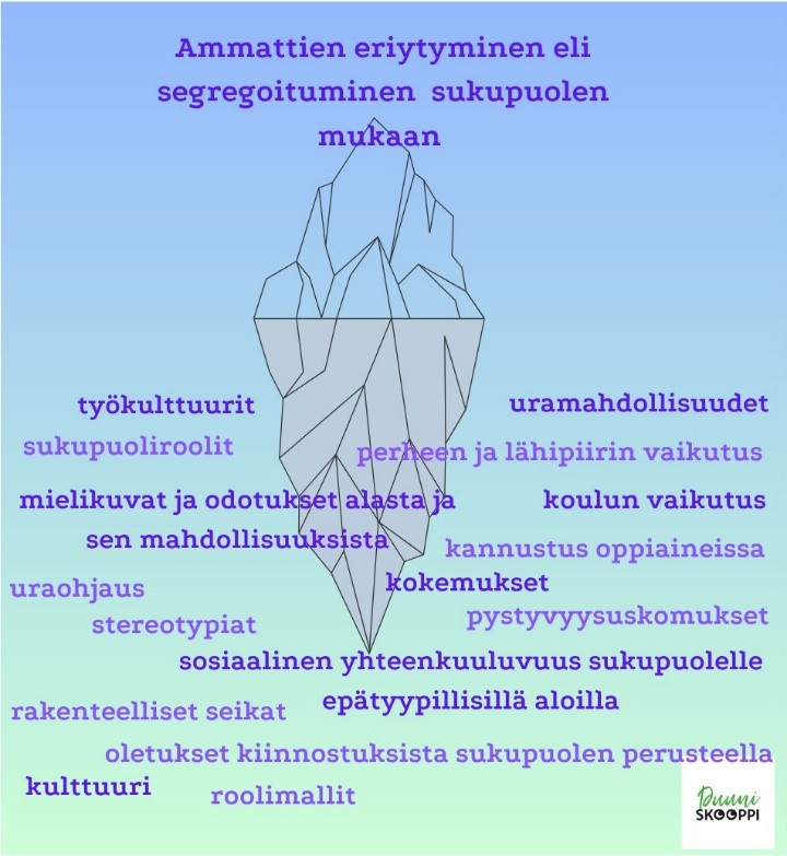 Ammattien eriytyminen eli segregoituminen sukupuolen mukaan on monisyinen ilmiö, johon on yhteydessä useita seikkoja. Segregaatiota voi ajatella jäävuorena, jossa eriytyminen näkyy ulospäin, mutta pinnan alla piilee useita vaikuttimia. Esimerkiksi tekijät, jotka liittyvät oppiainekiinnostuksiin, tukeen ja esteisiin, kulttuuriin, asenteisiin, odotuksiin ja mielikuviin alaa kohtaan sekä uskomuksiin omista kyvyistä voivat kaikki osaltaan vaikuttaa ammattikiinnostukseen (1). Sukupuolen kulttuuriset vaikutukset puolestaan voivat vaikuttaa siihen, millaisiin asioihin erilaisia henkilöitä kannustetaan ja ohjataan, ja tämä voi olla osaltaan yhteydessä myöhempään alojen segregoitumiseen. Kannustetaanko kaikkia sukupuolia tasapuolisesti erilaisiin toimintoihin, vai ohjataanko henkilöitä automaattisesti ja ehkä tiedostamattakin esimerkiksi sukupuolen mukaan?
