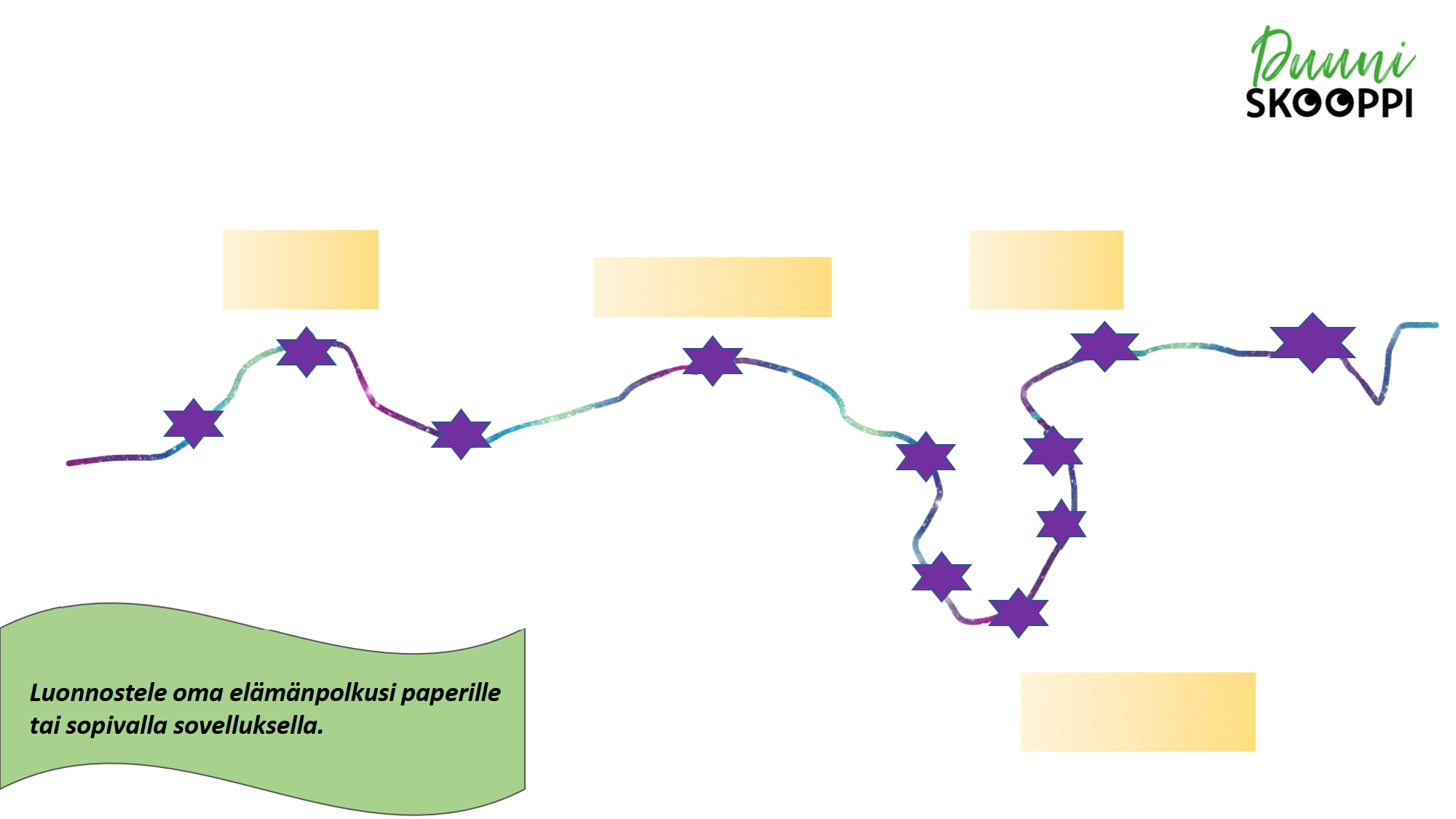 Elämänpolkutehtävä auttaa hahmottamaan uratarinasi, jonka pääset esittelemään nuorille työelämävierailun yhteydessä. Työelämäedustajana olet merkittävänä roolimallina kertoessasi urapolkujen moninaisuudesta ja niihin vaikuttavista tekijöistä nuorille.