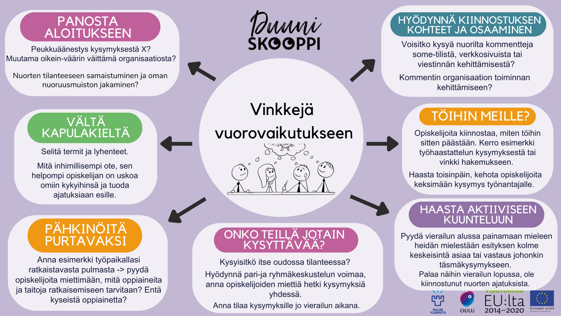 Jaa meille oma toimiva ideasi osaksi tätä materiaalia! Voit laittaa viestiä duuniskooppi@lists.oulu.fi.